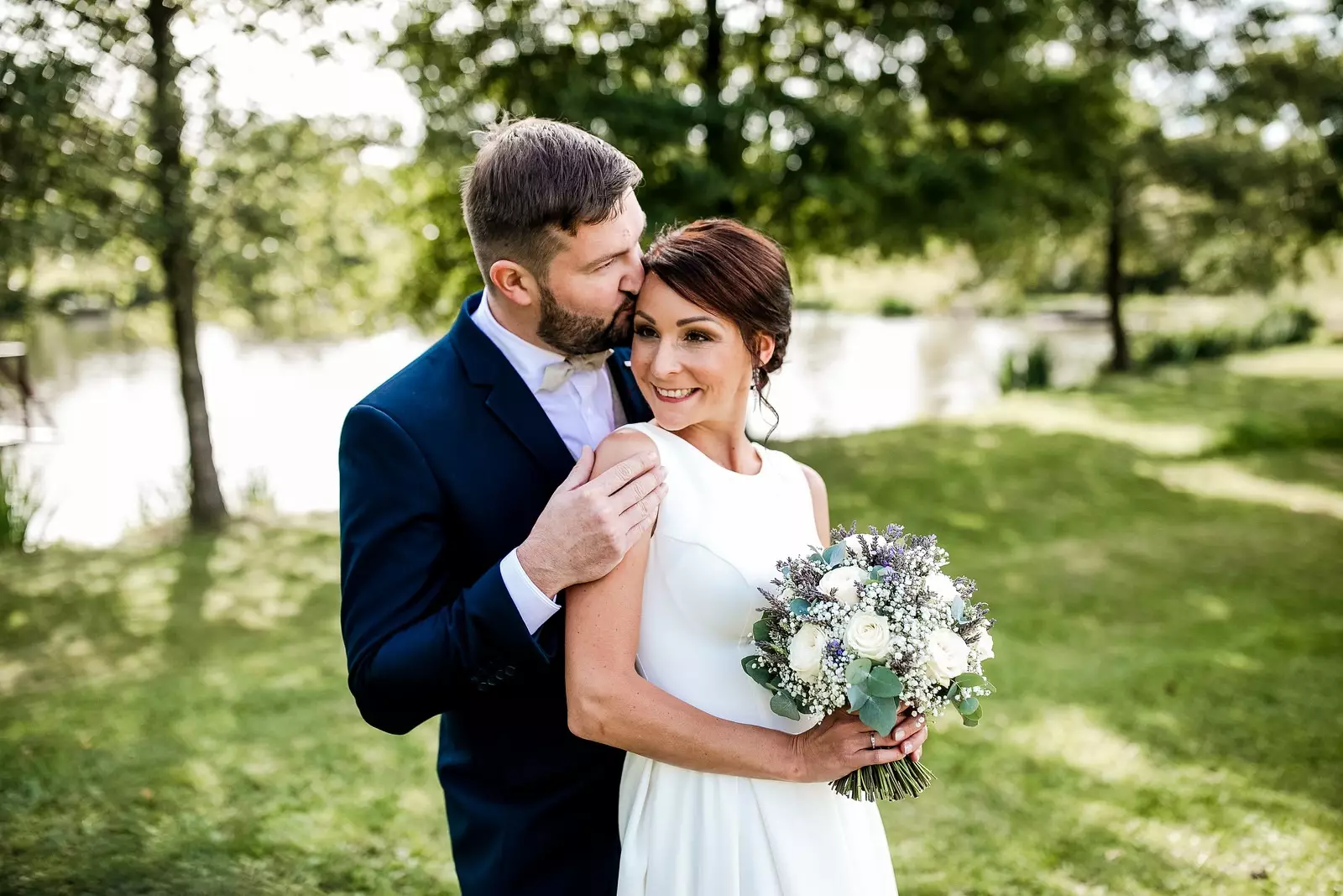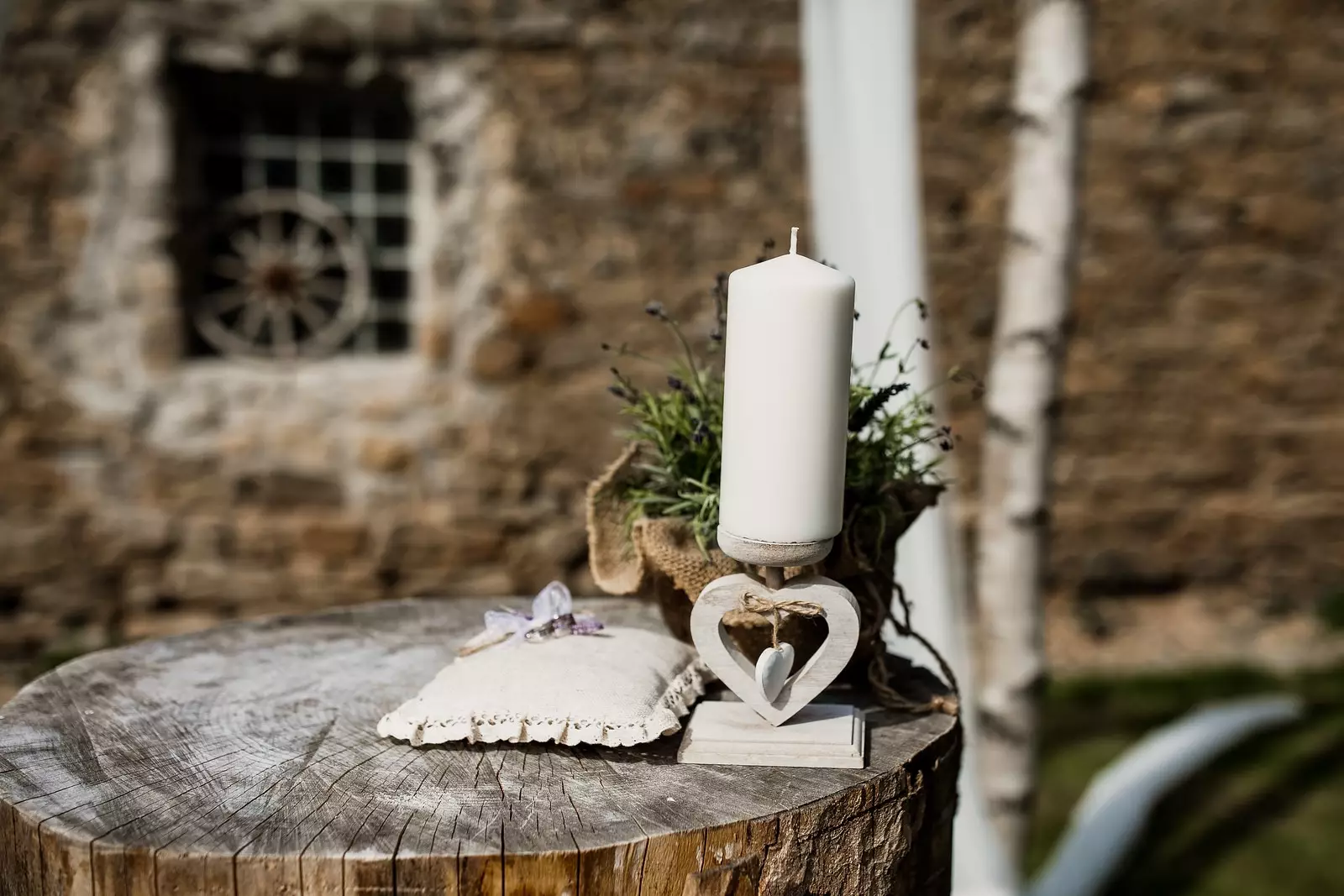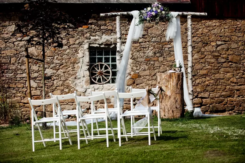 Obřad se odehrával na pozadí nádherné farmy Kalhov, kde se pohoda venkova snoubila s elegantní jednoduchostí eukalyptových a olivových větviček. Slunce svítilo, ptáci zpívali a vůně levandule se mísila s teplým vánkem. Stoly byly dekorovány v jemných odstínech levandule a zeleně, což dotvořilo atmosféru klidu a vřelosti.