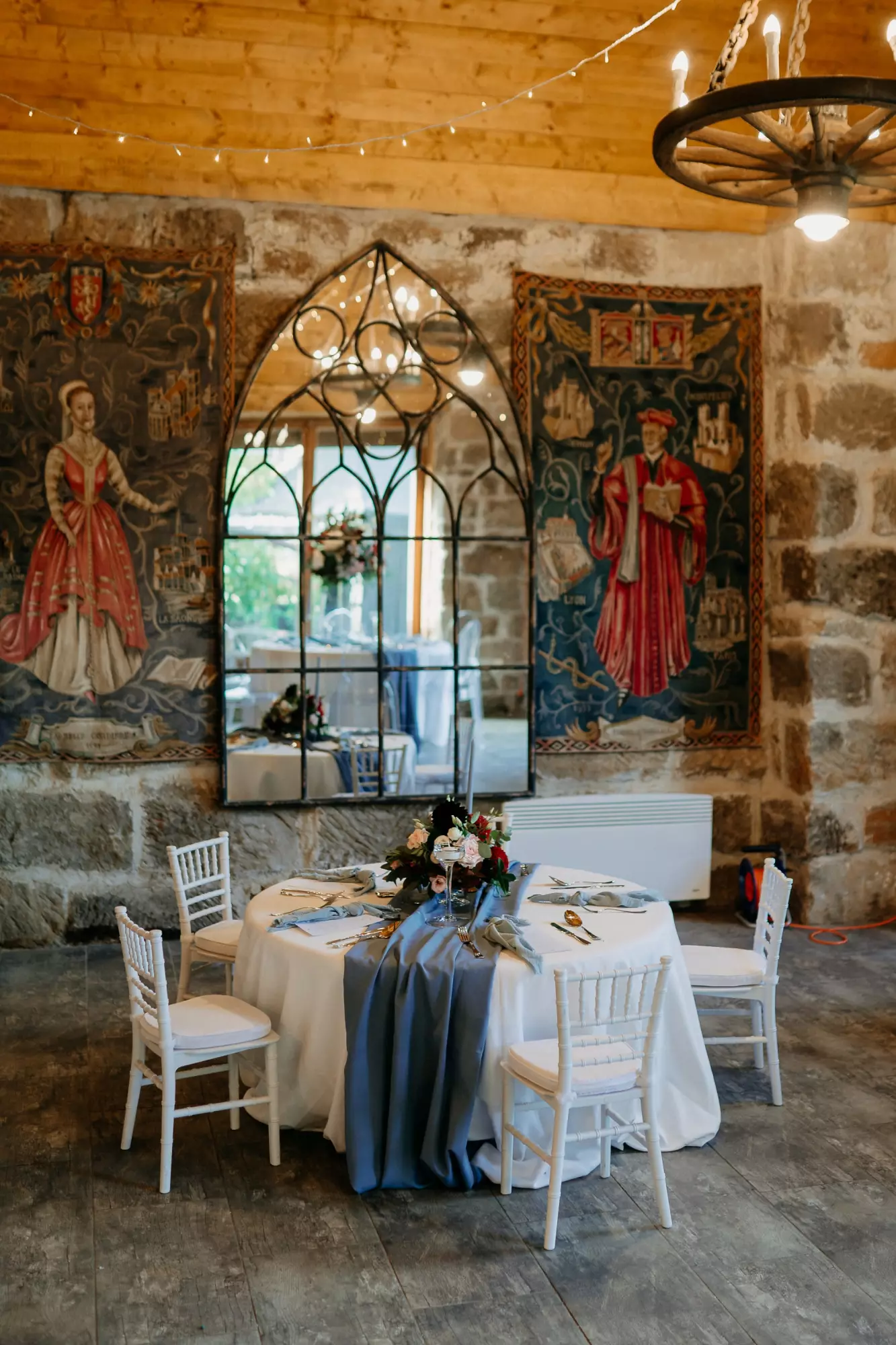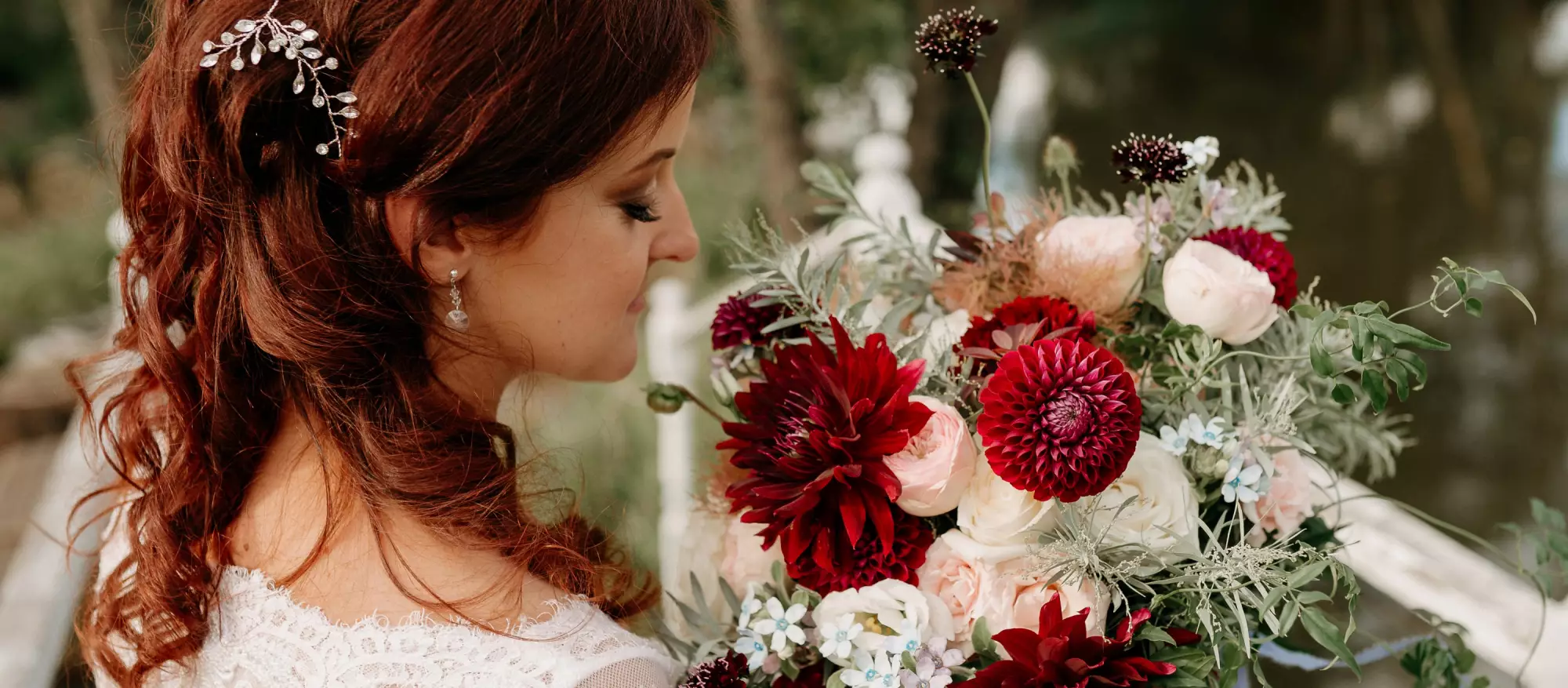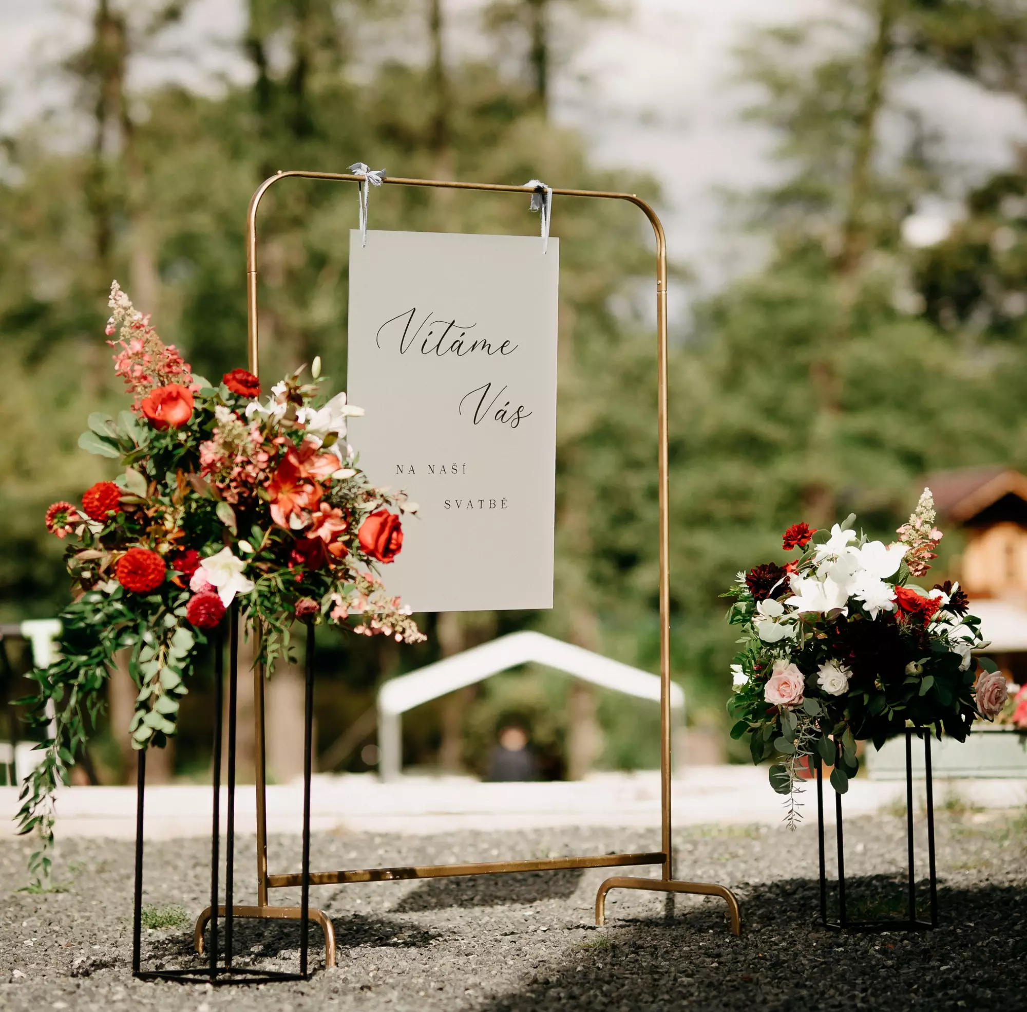 Dusty blue, bordo a růžová se staly hlavními barvami a objevily se všude - od ubrousků na stole až po elegantní květinové aranže. Velké květinové aranže tak byly nejen dekorací, ale i vyjádřením naší lásky a péče, kterou jsme věnovali pěstování každého jednotlivého květu. Obřadní květinový oblouk byl vrcholem celé dekorace a symbolizoval novou bránu do společného života Verunky a Ondry.